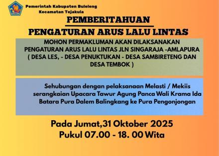 Berikut kami sampaikan informasi terkait akan dilaksanakan "Pengaturan Lalu Lintas Jln. Singaraja-Amlapura (Desa Les- Desa Penuktukan-Desa Sambirenteng-Desa Tembok)" sehubungan dengan pelaksanaan Melasti/Mekiis serangkaian Upacara Tawur Agung Panca Wali Krama Ida Batara Dalem Balingkang ke Pura Pegonjongan.